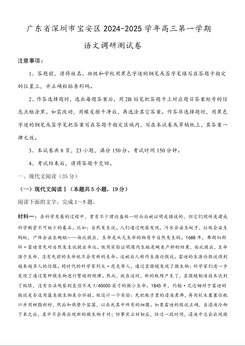 广东省深圳市宝安区2025届高三上学期10月第一次调研测试语文+答案