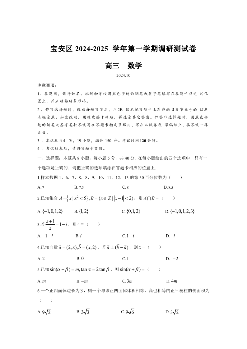 广东省深圳市宝安区2025届高三上学期10月第一次调研测试数学+答案