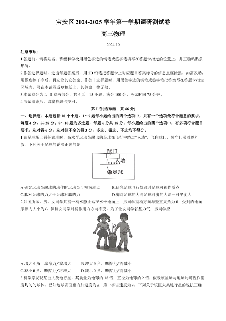 广东省深圳市宝安区2025届高三上学期10月第一次调研测试物理+答案