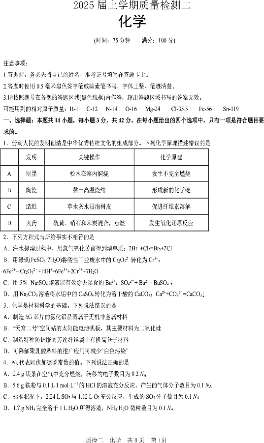 河北省部分学校2024-2025学年高三上学期第二次质检化学
