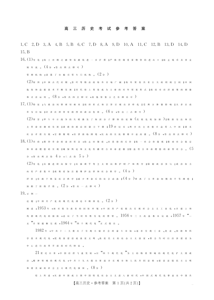 湖北省部分高中2025届高三上学期10月联考历史答案