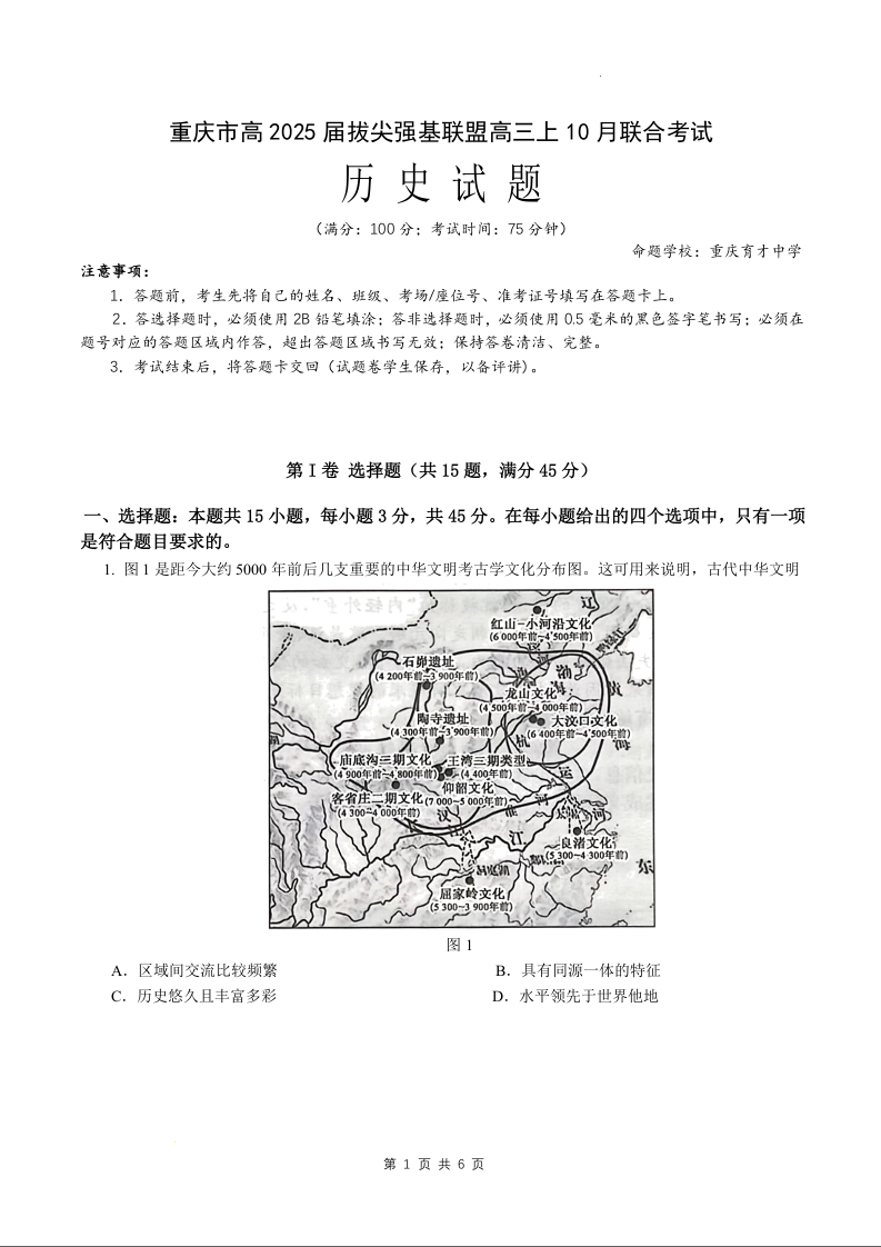 重庆市高2025届拔尖强基联盟高三上10月联合考试历史