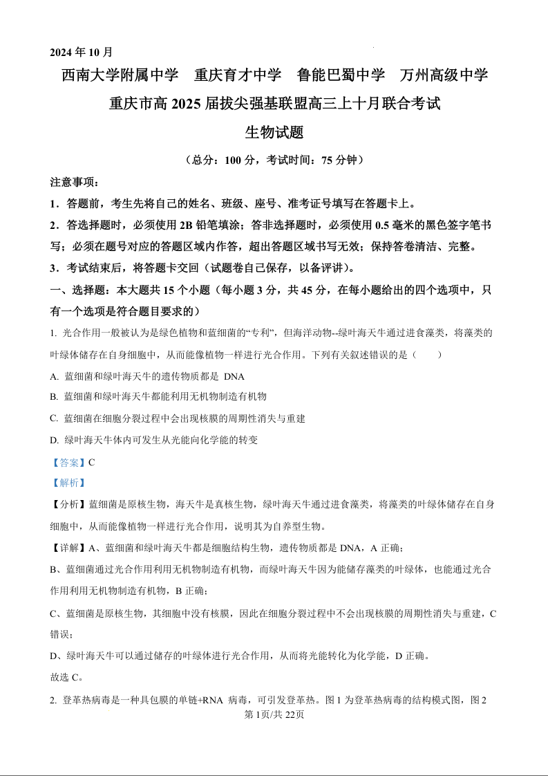重庆市高2025届拔尖强基联盟高三上10月联合考试生物试题(解析版)