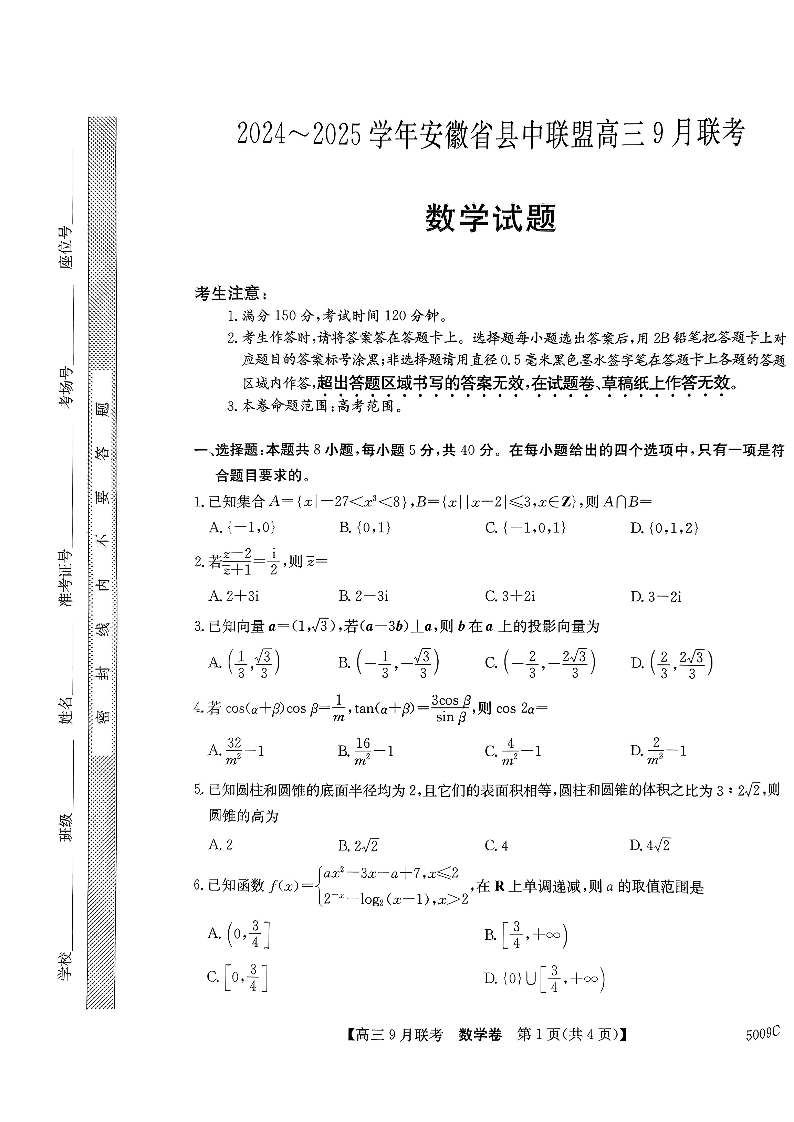 安徽县中联盟2024-2025学年高三9月联考数学试题
