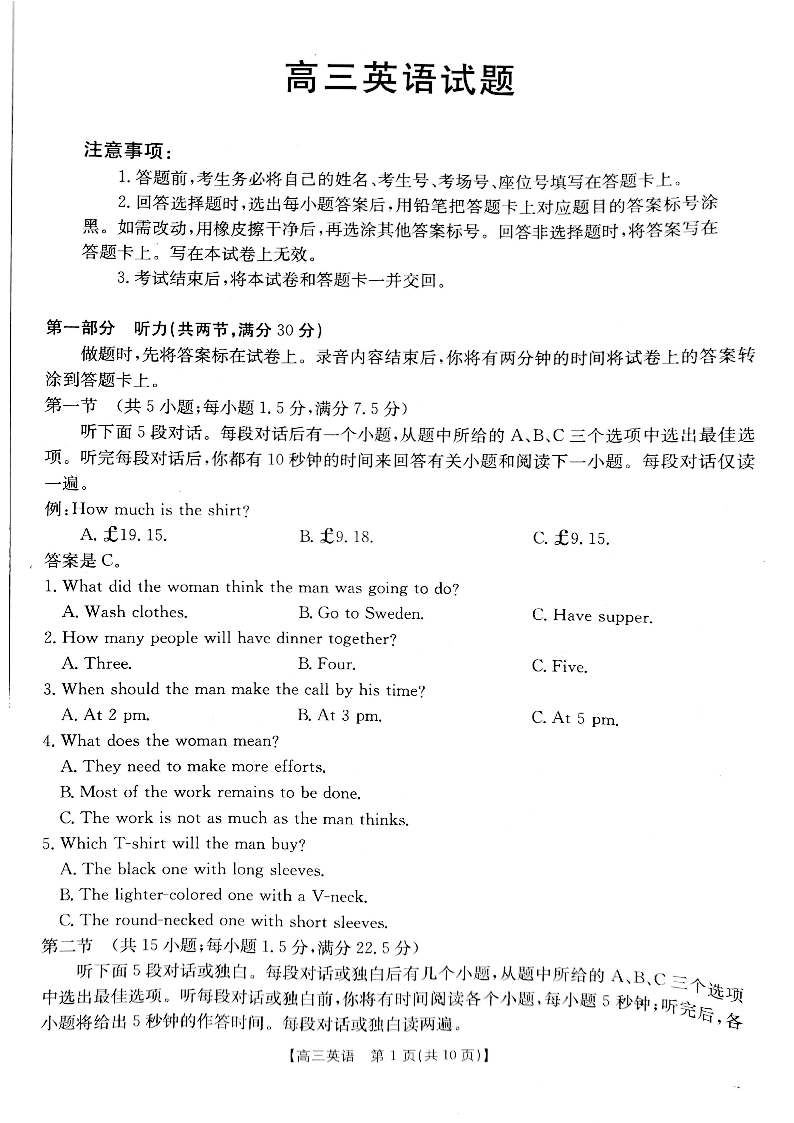 山西省部分学校2025届高三上学期9月联考英语+答案