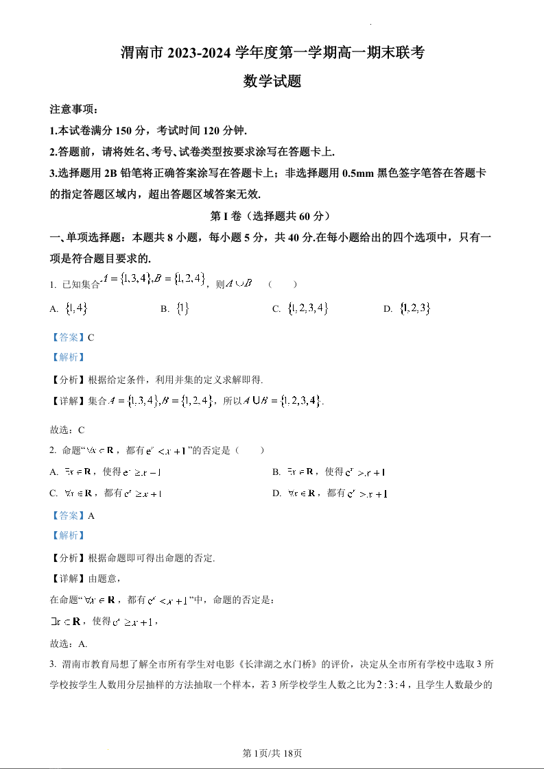 陕西省渭南市2023-2024学年高一上学期期末考试数学(精品解析版)