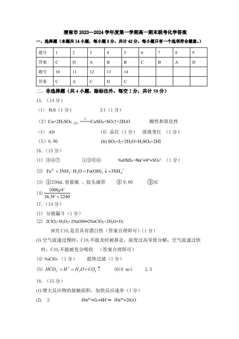 陕西省渭南市2023-2024学年高一上学期期末考试化学答案