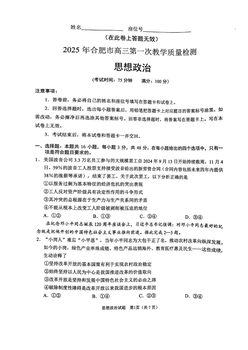 安徽省合肥市2025届高三第一次教学质量检测(一模)政治+答案