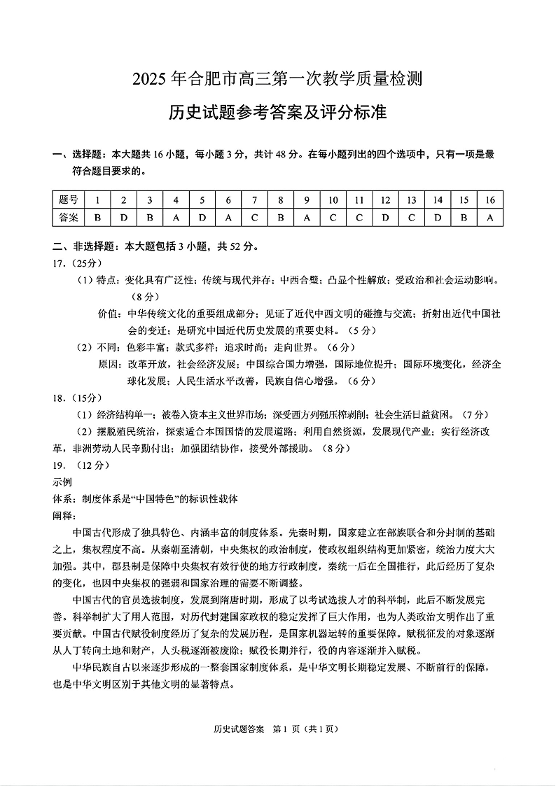 安徽省合肥市2025届高三第一次教学质量检测(一模)历史答案
