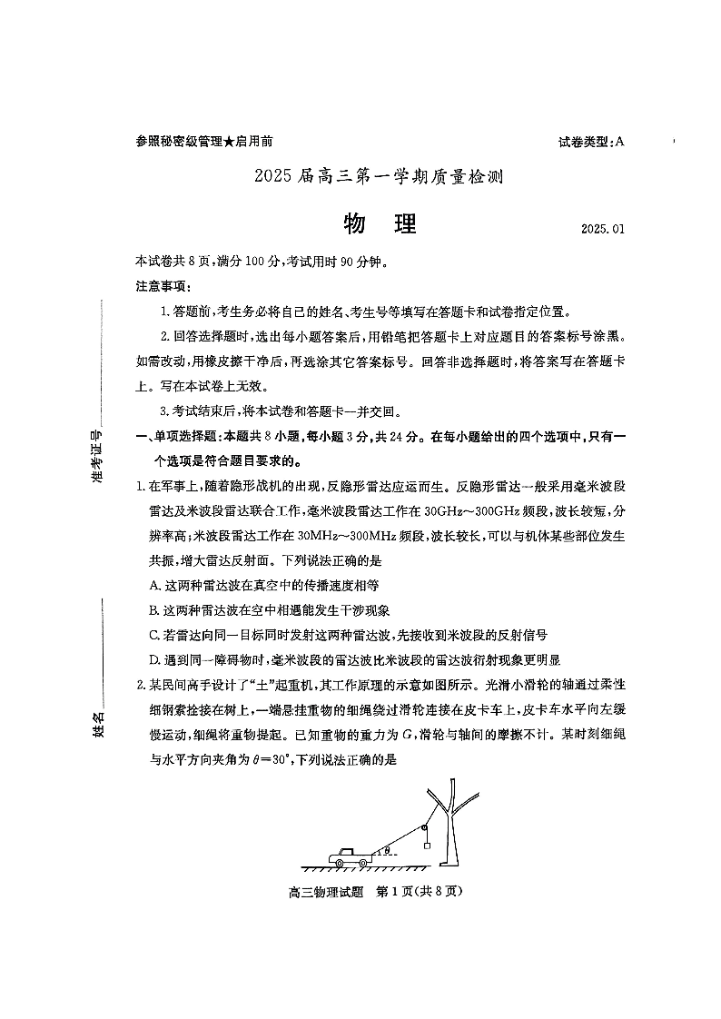 山东省枣庄市2025届高三上学期1月期末质量检测物理