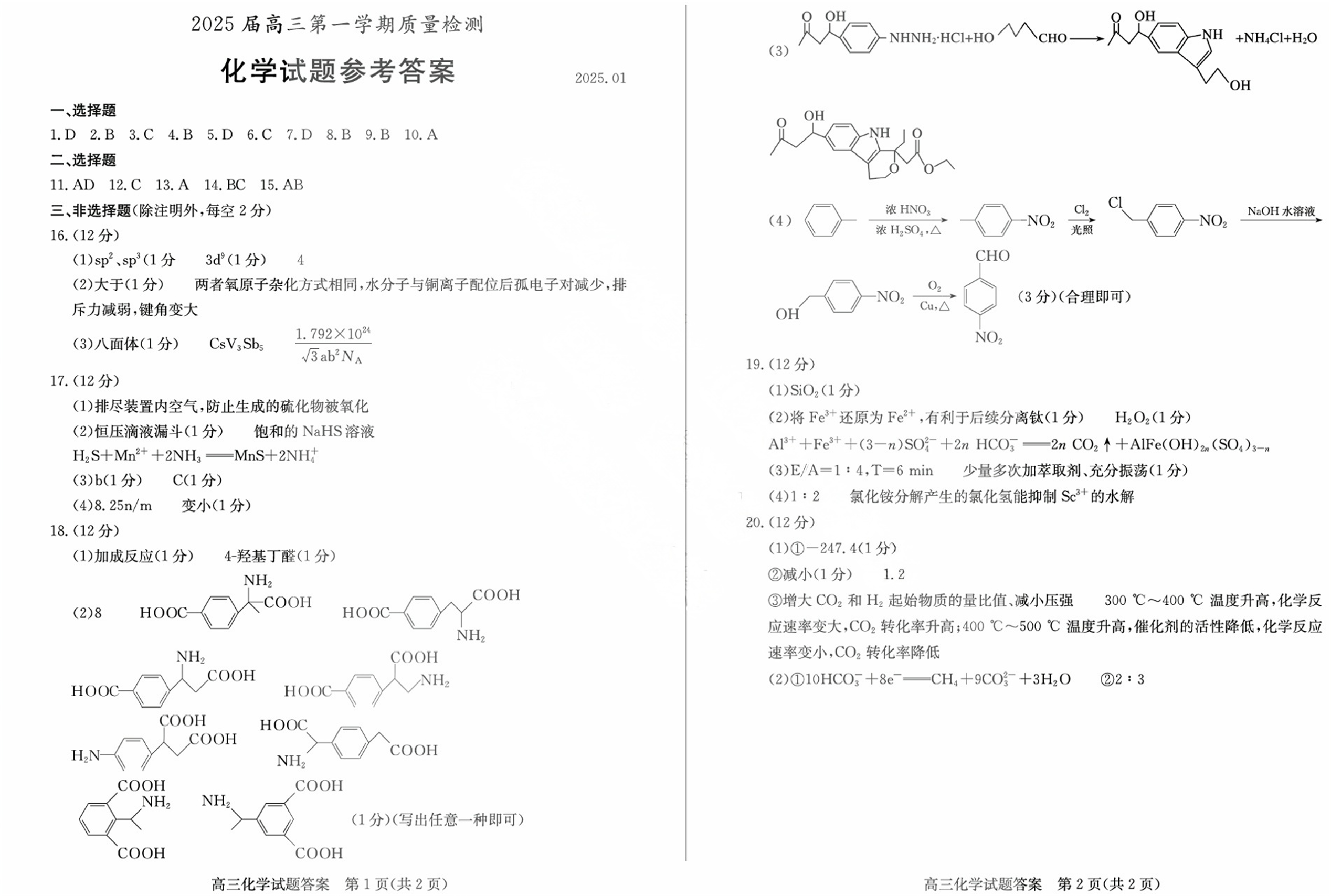 山东省枣庄市2025届高三上学期1月期末质量检测化学答案