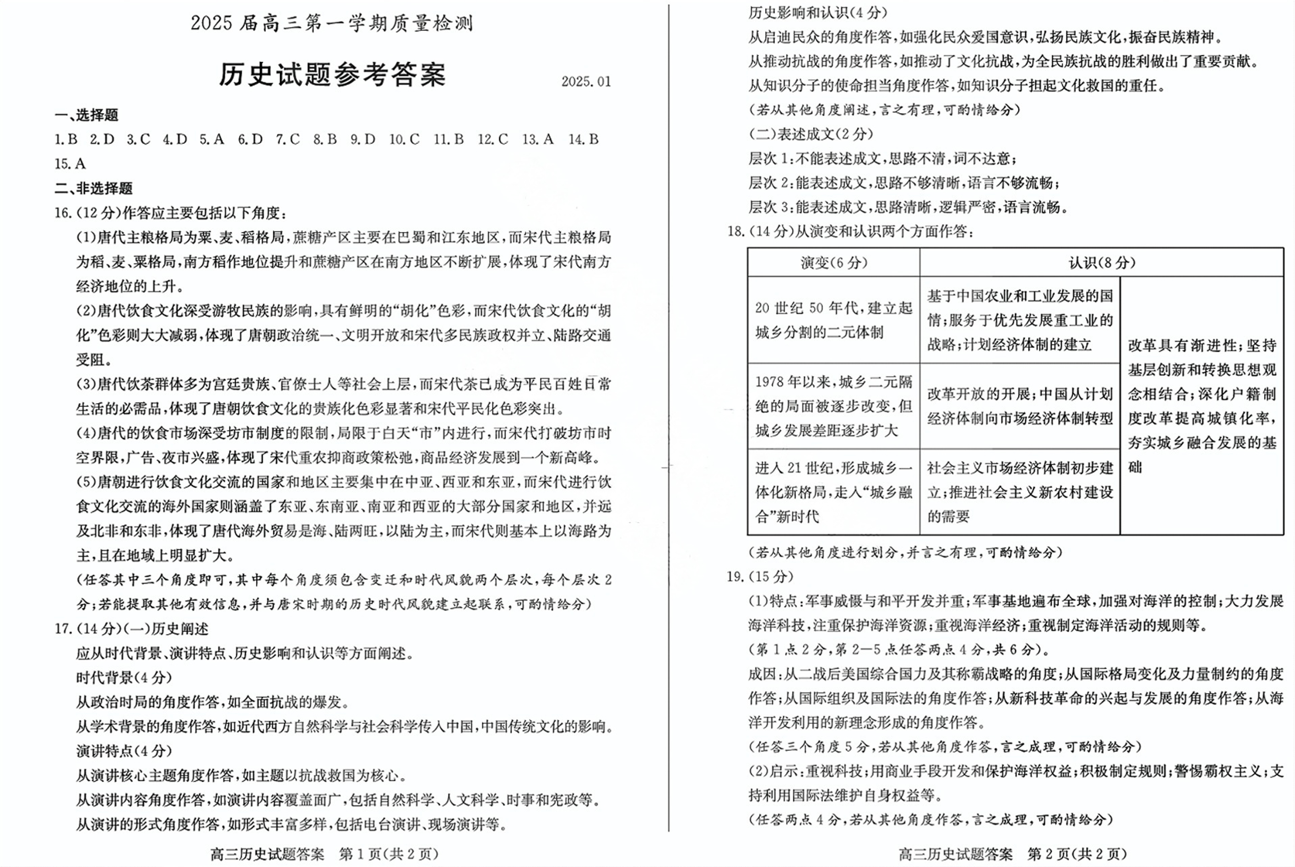 山东省枣庄市2025届高三上学期1月期末质量检测历史答案