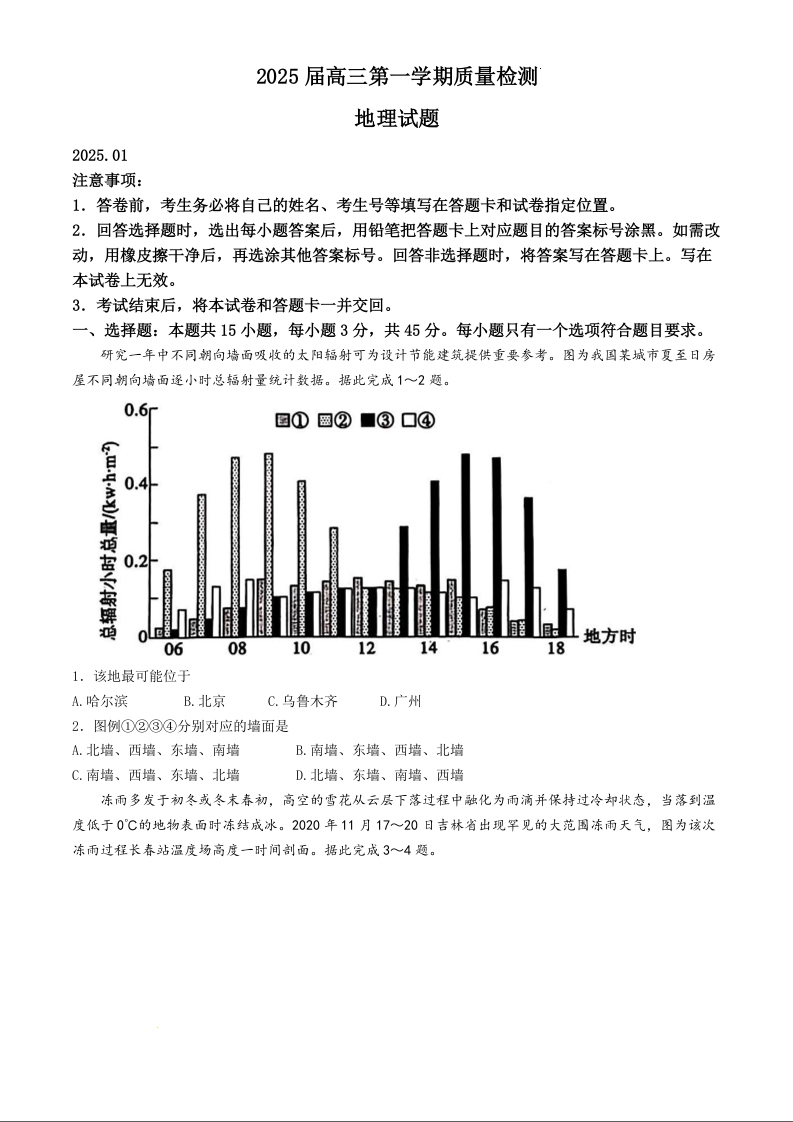 山东省枣庄市2025届高三上学期1月期末质量检测地理+答案