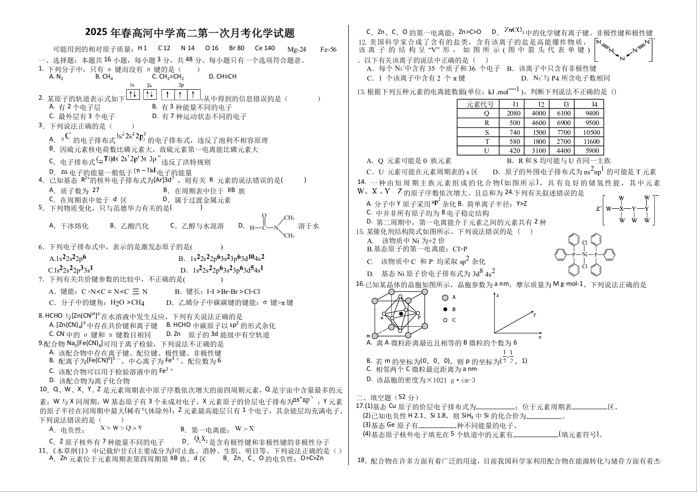 安徽省安庆市怀宁县高河中学2024-2025学年下学期4月高二月考化学+答案