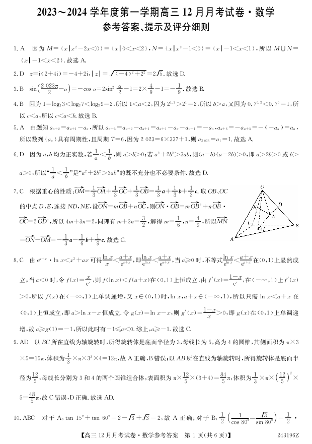 山西省卓越联盟2024届高三上学期12月联考数学答案