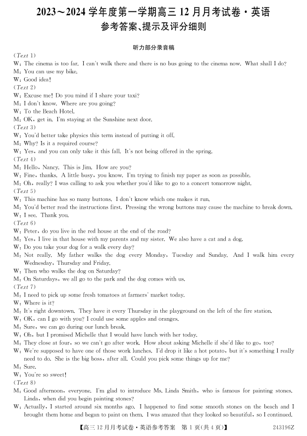 山西省卓越联盟2024届高三上学期12月联考英语答案