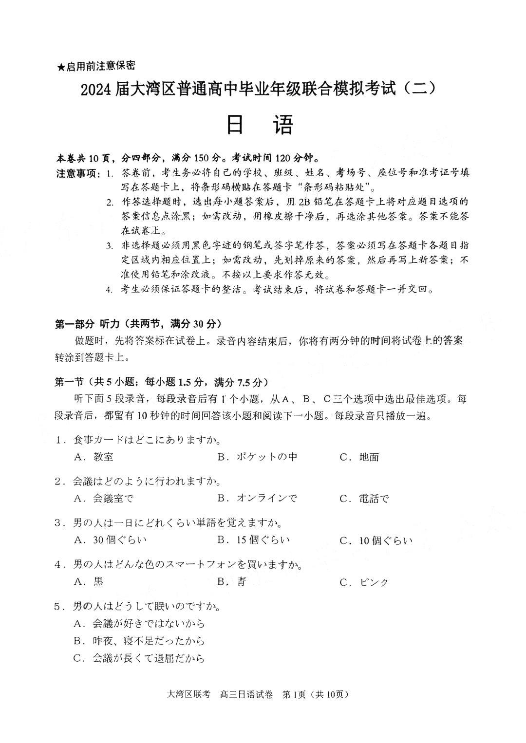 广东省大湾区2024届普通高中毕业年级联合模拟考试(二)日语