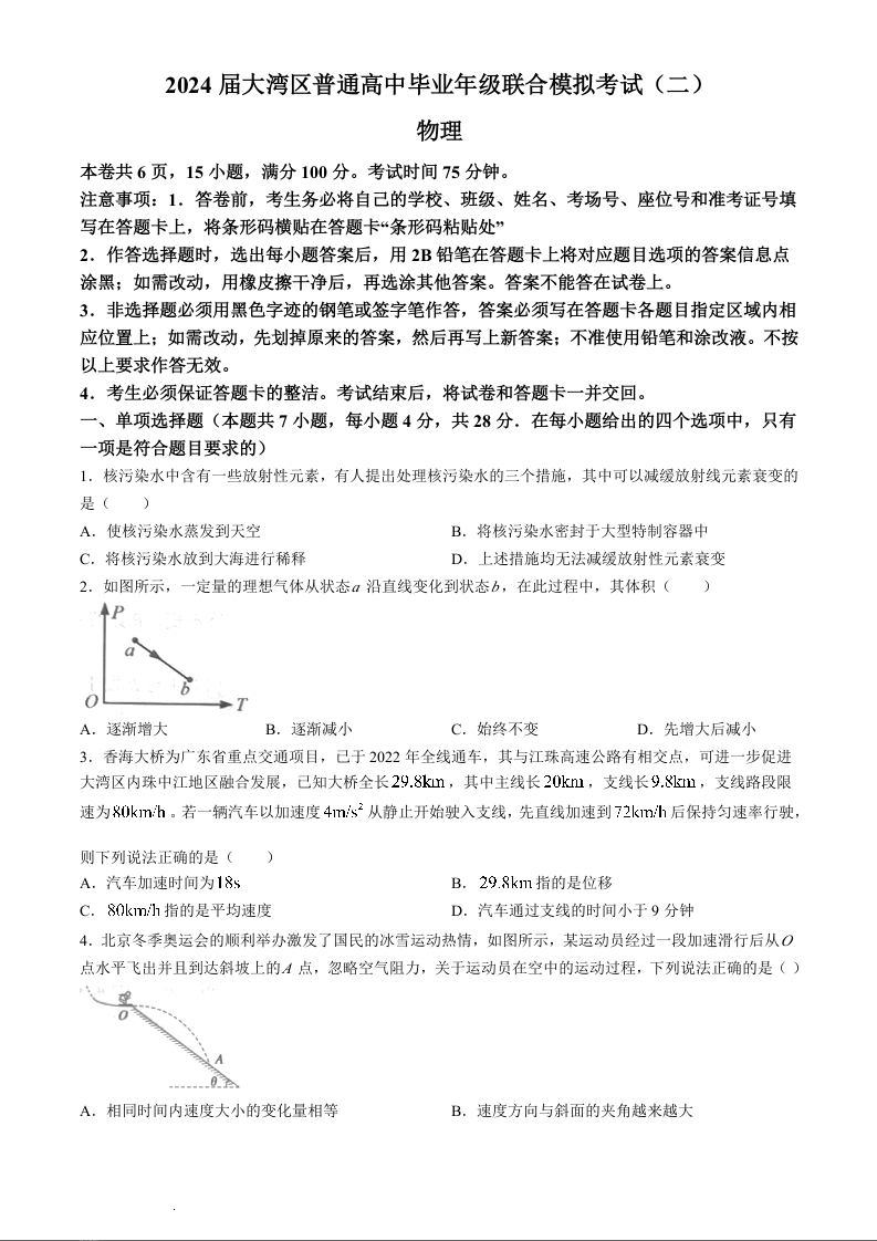 广东省大湾区2024届普通高中毕业年级联合模拟考试(二)物理+答案