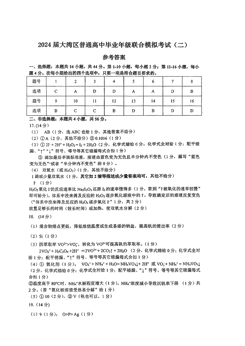 广东省大湾区2024届普通高中毕业年级联合模拟考试(二)化学答案
