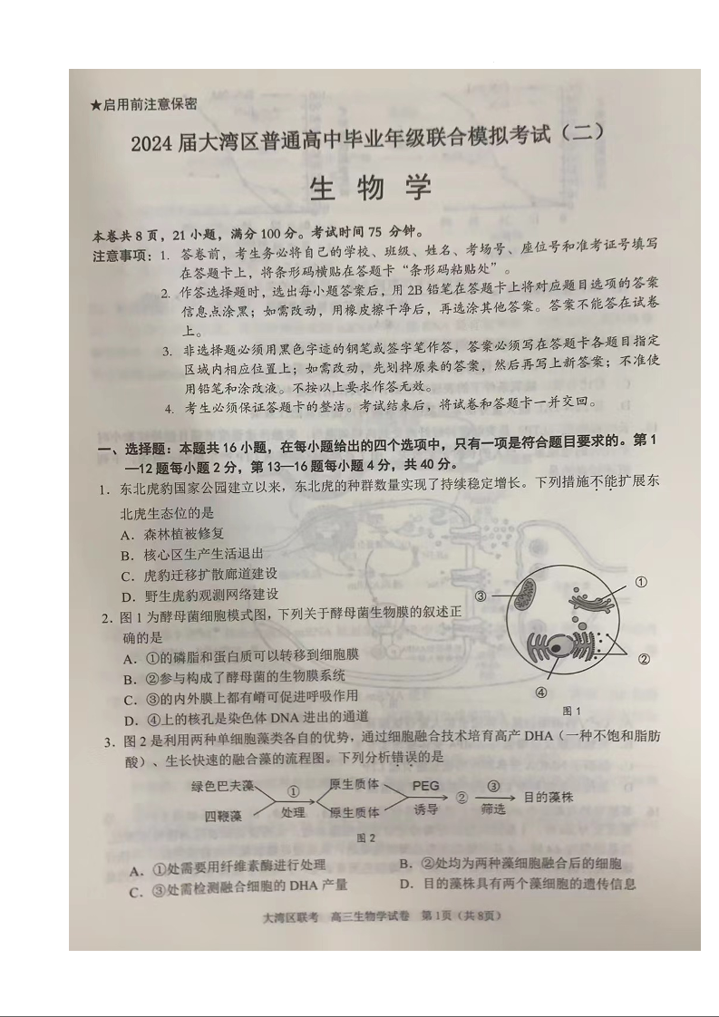 广东省大湾区2024届普通高中毕业年级联合模拟考试(二)生物