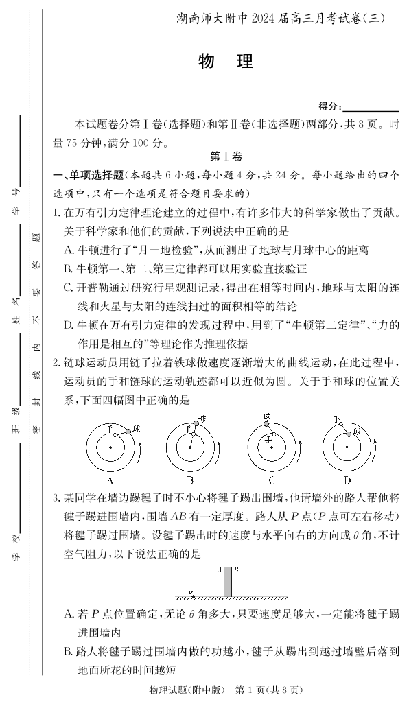 湖南省师范大学附属中学2024届高三上学期月考(三)物理