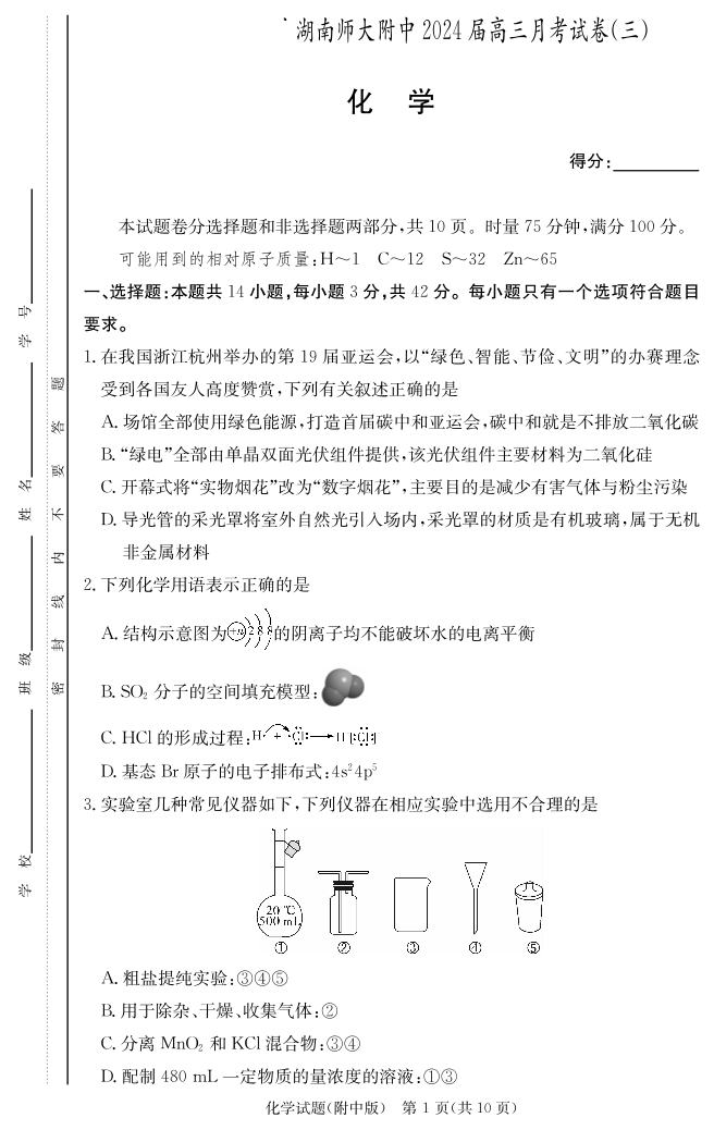 湖南省师范大学附属中学2024届高三上学期月考(三)化学