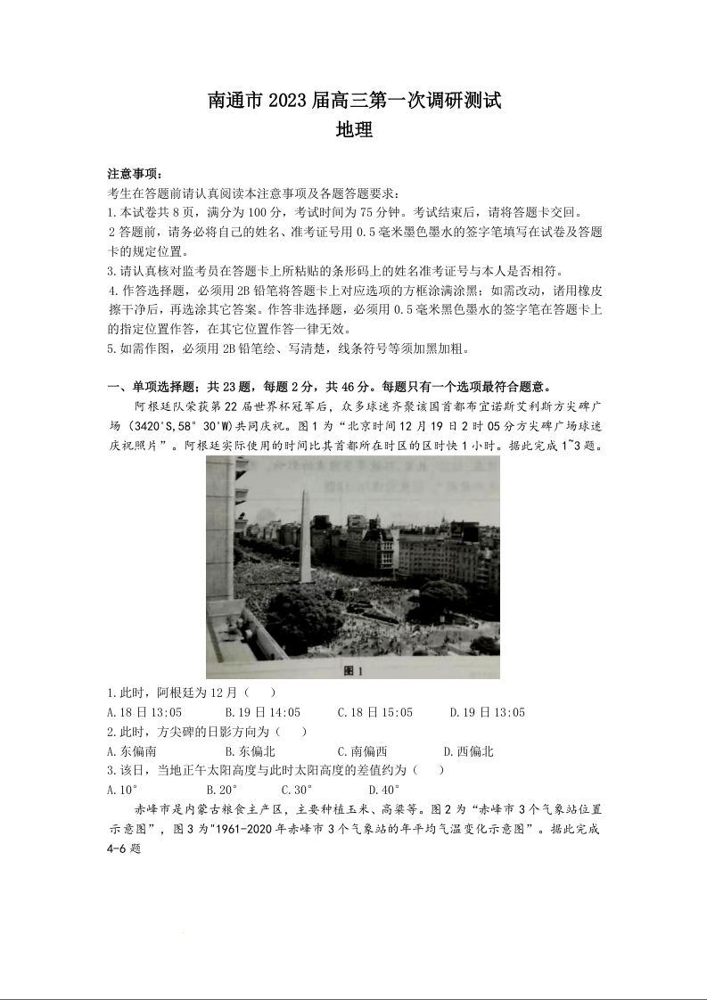 高三地理--江苏省苏北七市2023高三第一次调研测试(南通一模)