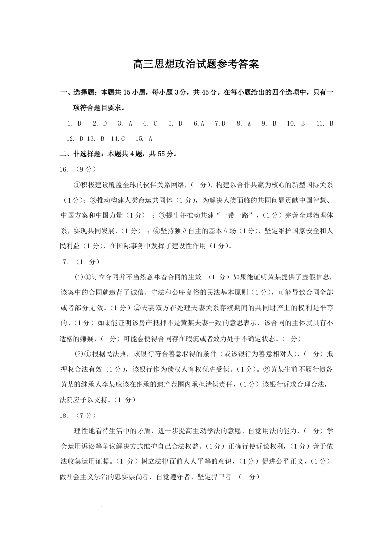 高三政治答案--山东省德州市2023高三上学期1月期末