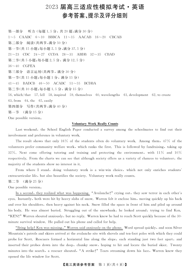高三英语答案--湖南省郴州市2023届高三适应性模拟考试(郴州三模)