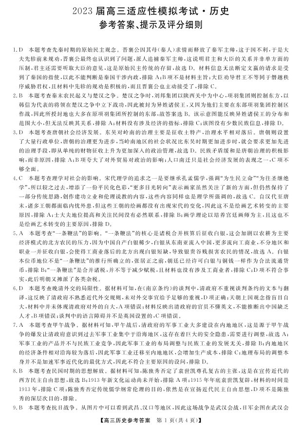 高三历史答案--湖南省郴州市2023届高三适应性模拟考试(郴州三模)