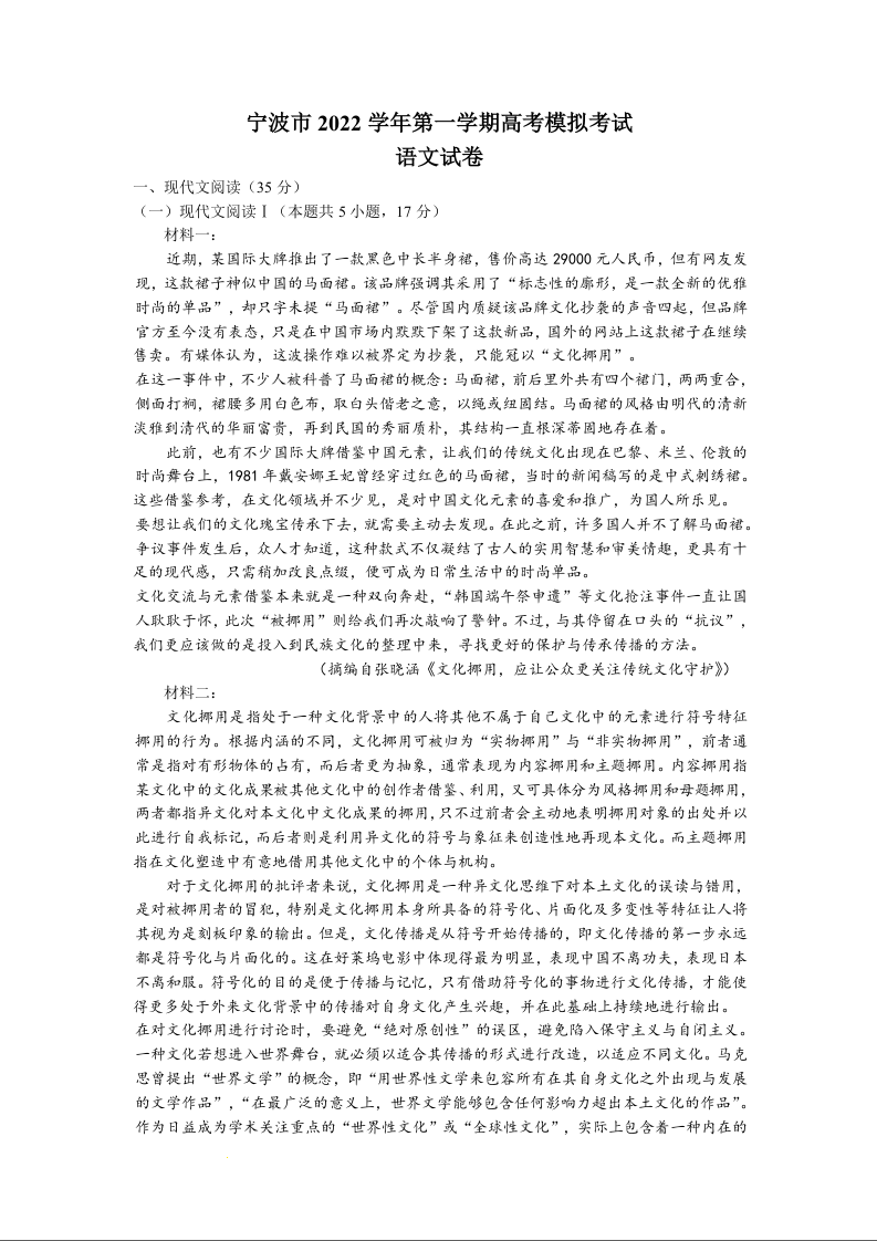 高三语文+答案--浙江省宁波市2023届高三上学期一模