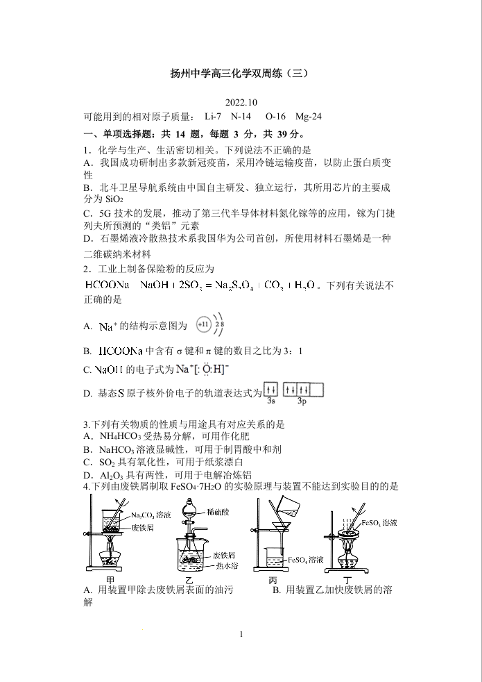 高三化学+答案--江苏省扬州中学2023届高三上学期10月双周练(三)