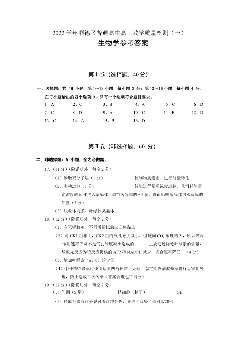 高三生物答案--广东省佛山市顺德区2023届高三11月教学质量检测(一)