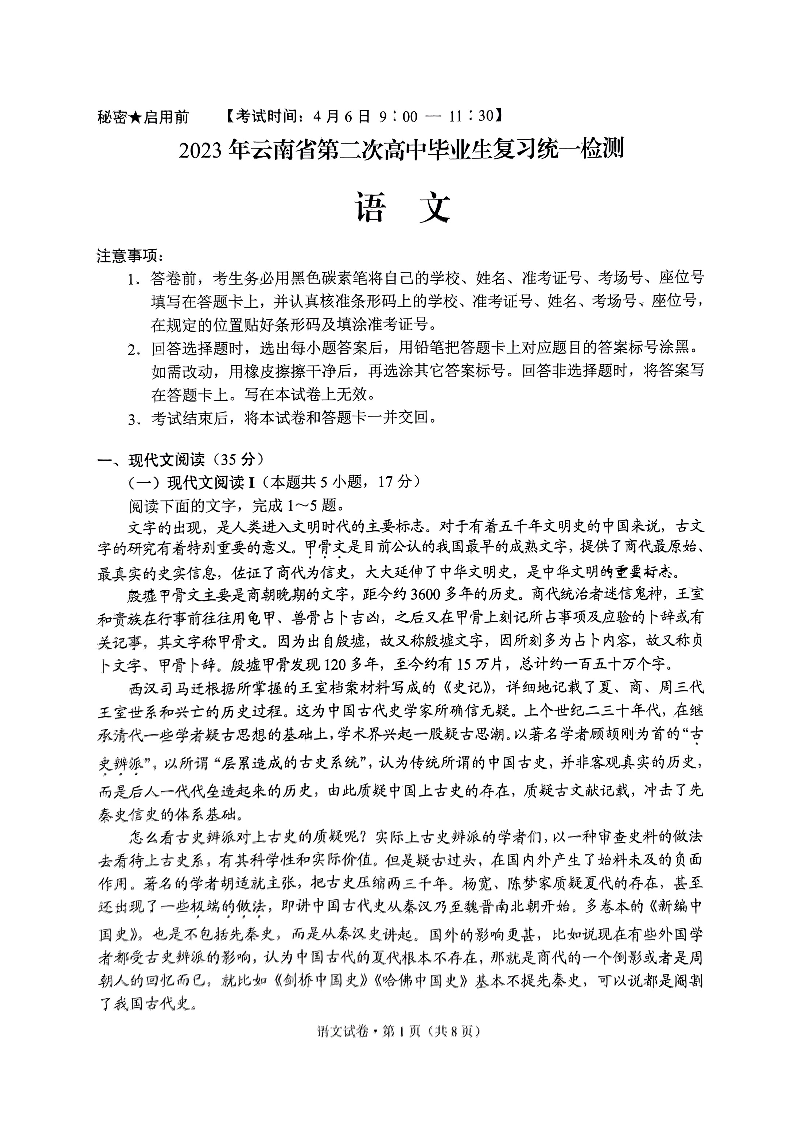高三语文--2023 年云南省第二次高中毕业生复习统一检测(云南统测二)