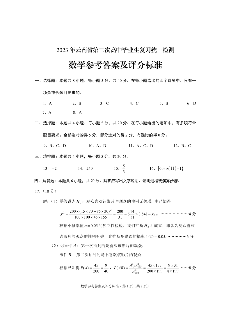高三数学答案--2023 年云南省第二次高中毕业生复习统一检测(云南统测二)