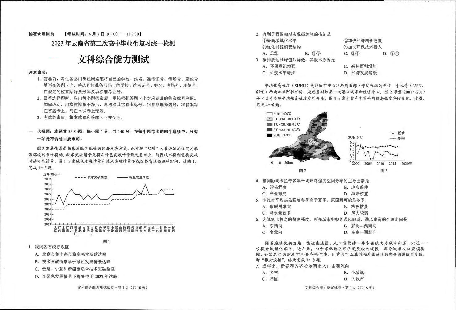 高三文综--2023 年云南省第二次高中毕业生复习统一检测(云南统测二)