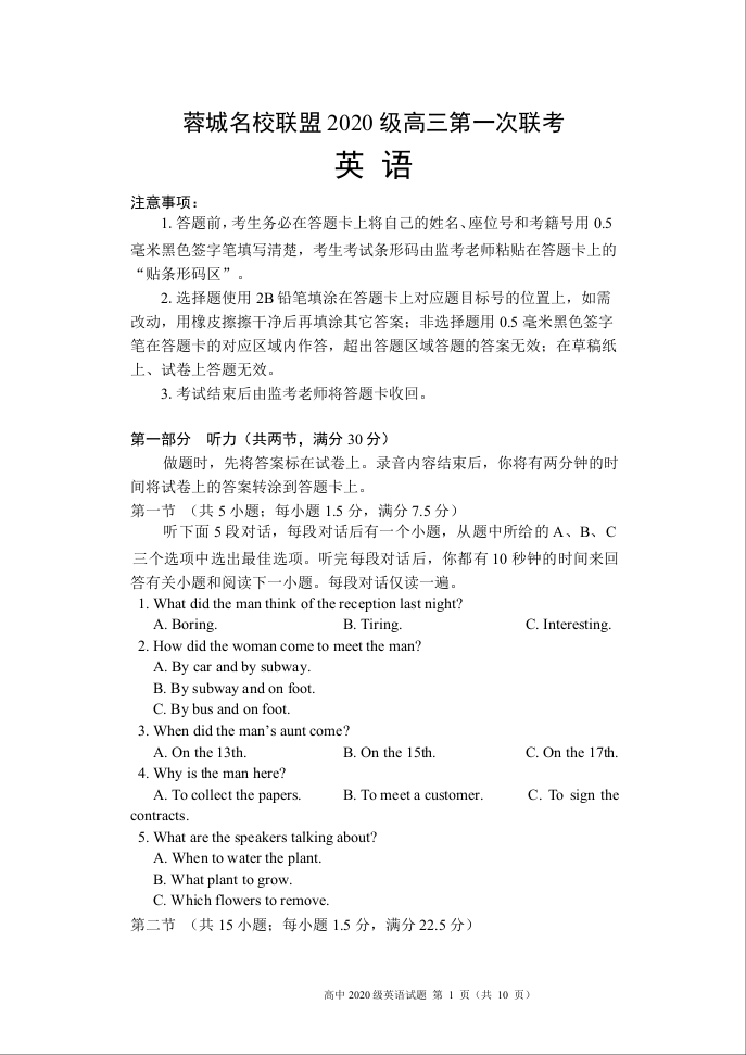 高三英语--四川省成都市蓉城名校联盟2022-2023学年高三上学期第一次联考