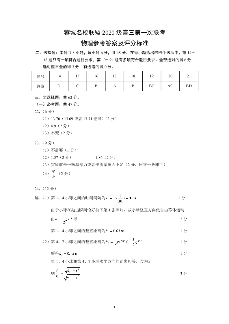 高三理综物理答案--四川省成都市蓉城名校联盟2022-2023学年高三上学期第一次联考