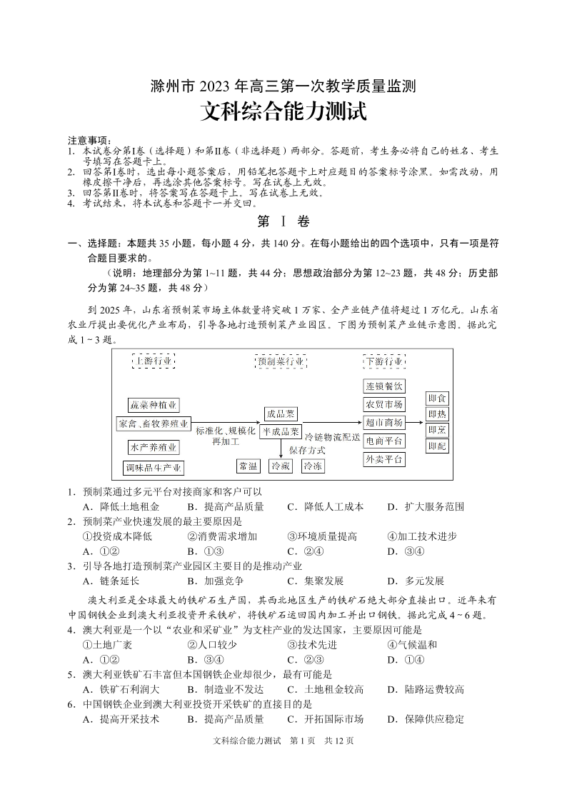 高三文综--安徽省滁州市2023届高三上学期1月期末