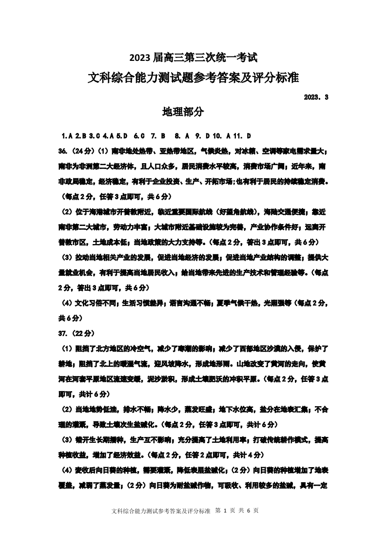 高三文综答案--内蒙古赤峰市高三第三次统一考试3.15-16