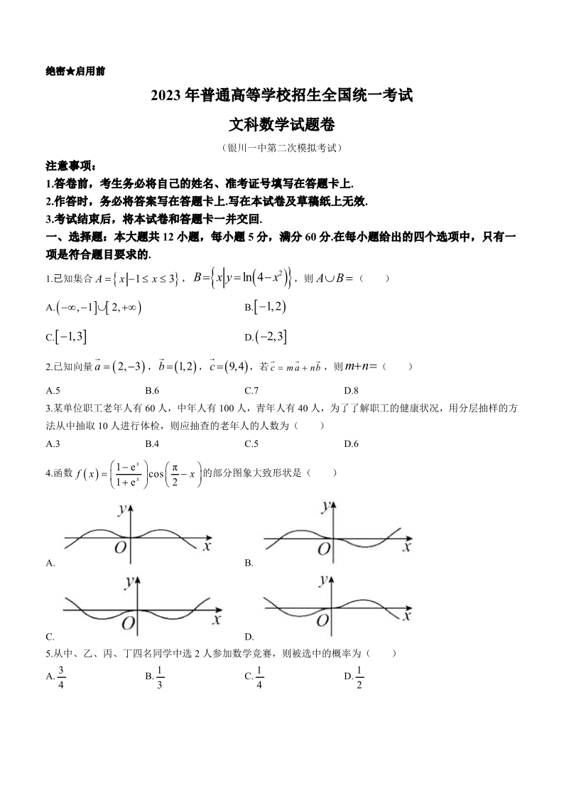 高三文科数学+答案--宁夏回族自治区银川一中2023届高三下学期第二次模拟考试