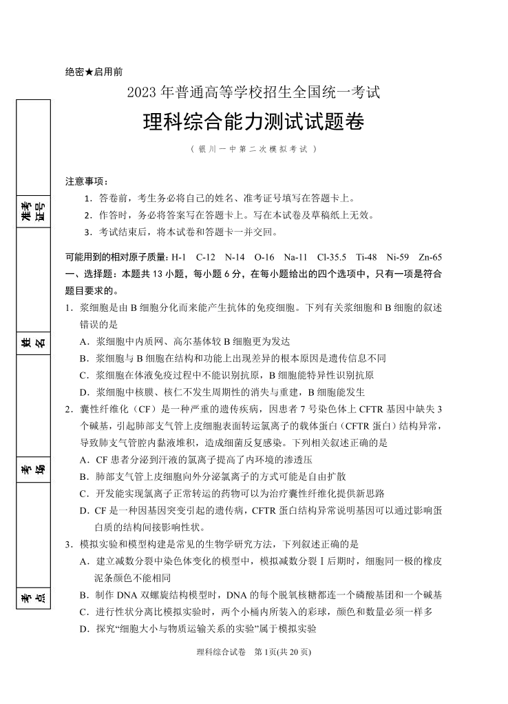 高三理综--宁夏回族自治区银川一中2023届高三下学期第二次模拟考试