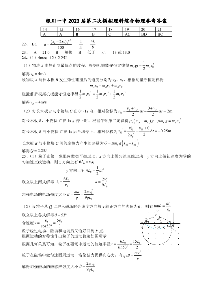 高三理综物理答案--宁夏回族自治区银川一中2023届高三下学期第二次模拟考试