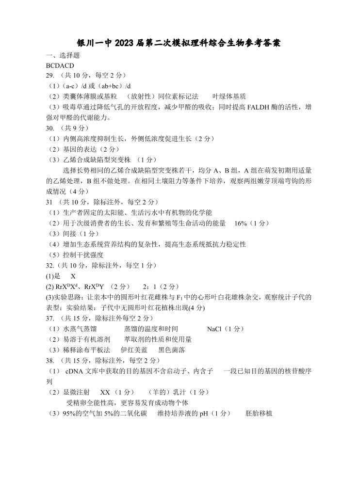高三理综生物答案--宁夏回族自治区银川一中2023届高三下学期第二次模拟考试