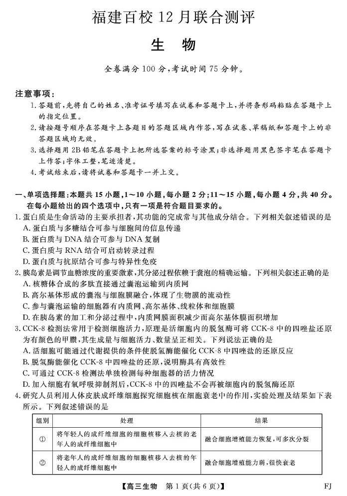 高三生物--福建省百校2026届高三上学期12月联合测评