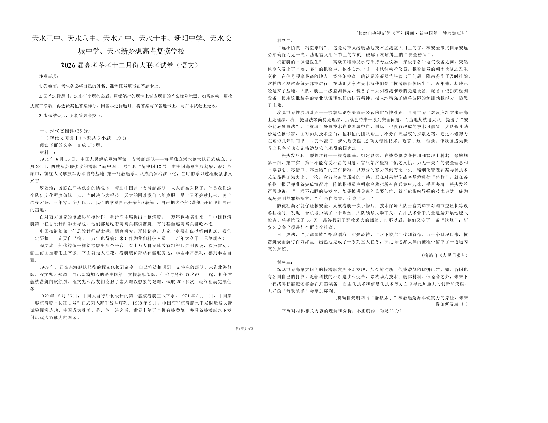高三语文--甘肃省天水市麦积区部分学校2026届高三上学期12月联考