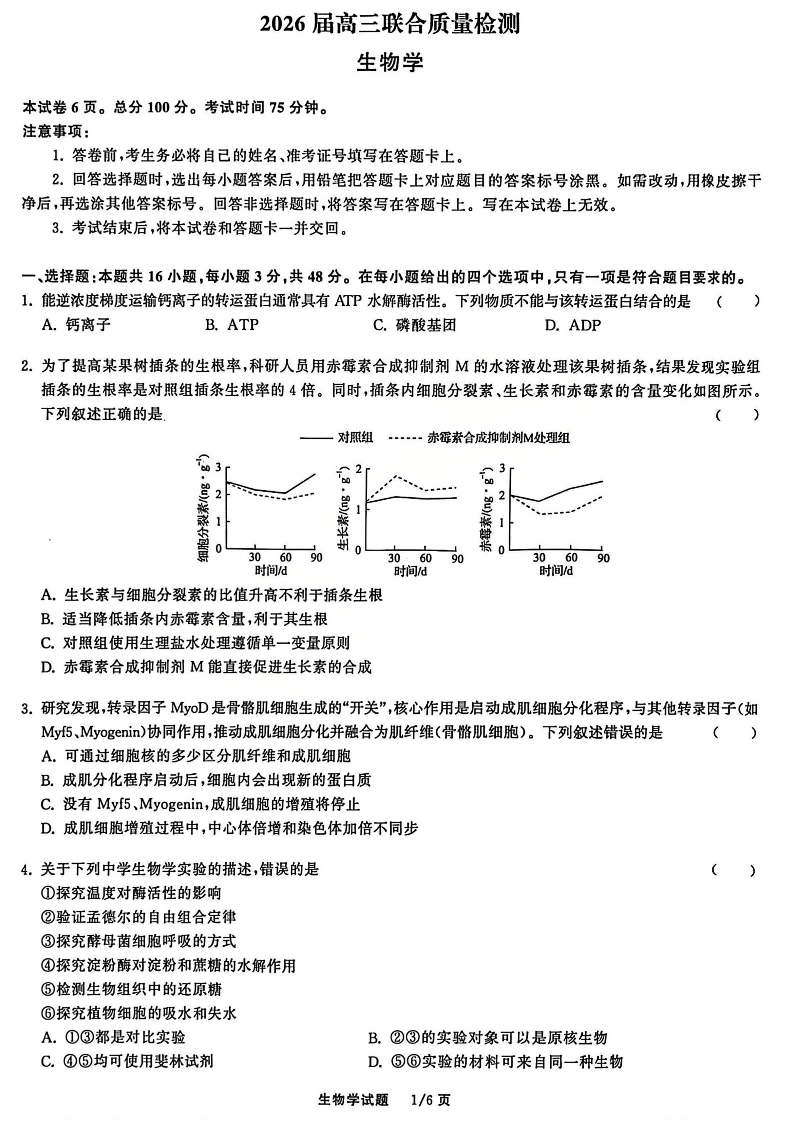高三生物--陕晋宁青地区2026届天舟高考高三12月联合质量检测