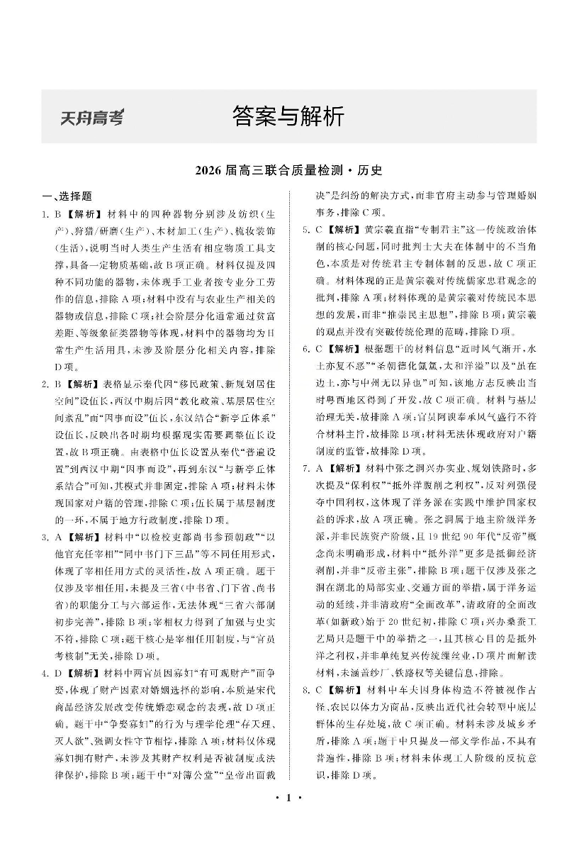 高三历史答案--陕晋宁青地区2026届天舟高考高三12月联合质量检测