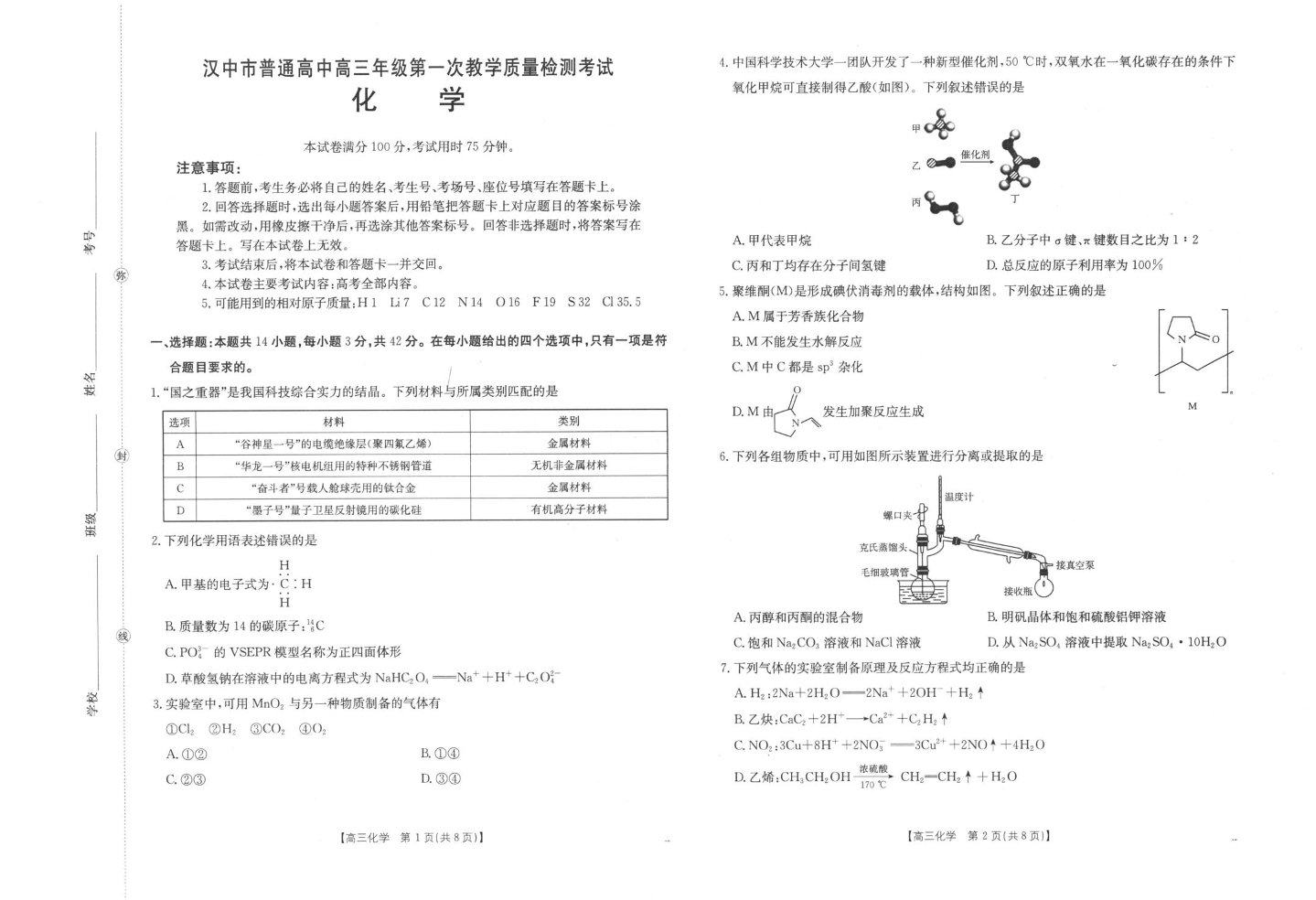 高三化学--陕西省汉中市2026届高三第一次教学质量检测考试(汉中一模)