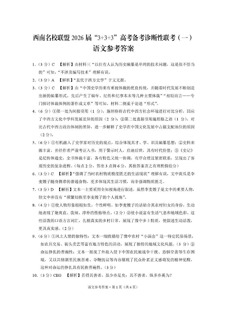 高三语文答案--云南贵州省西南名校联盟 2026届“3+3+3’高考备考诊断性联考(一)